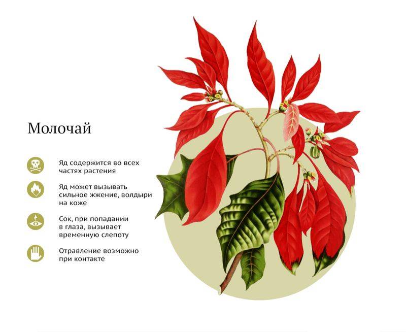 If you cut off the leaves from the poinsettia, they will begin to emit poisonous white milk, which provokes burns and irritation.