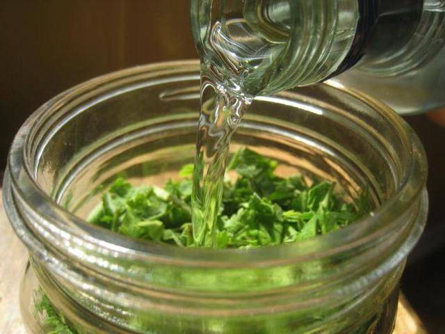 This is the first and most common remedy. For cooking, you need to grind the previously prepared leaves, pour them with alcohol or vodka. Place the container with the contents in a dark place and incubate for 14 days. After that, the tincture must be stored strictly in the refrigerator.