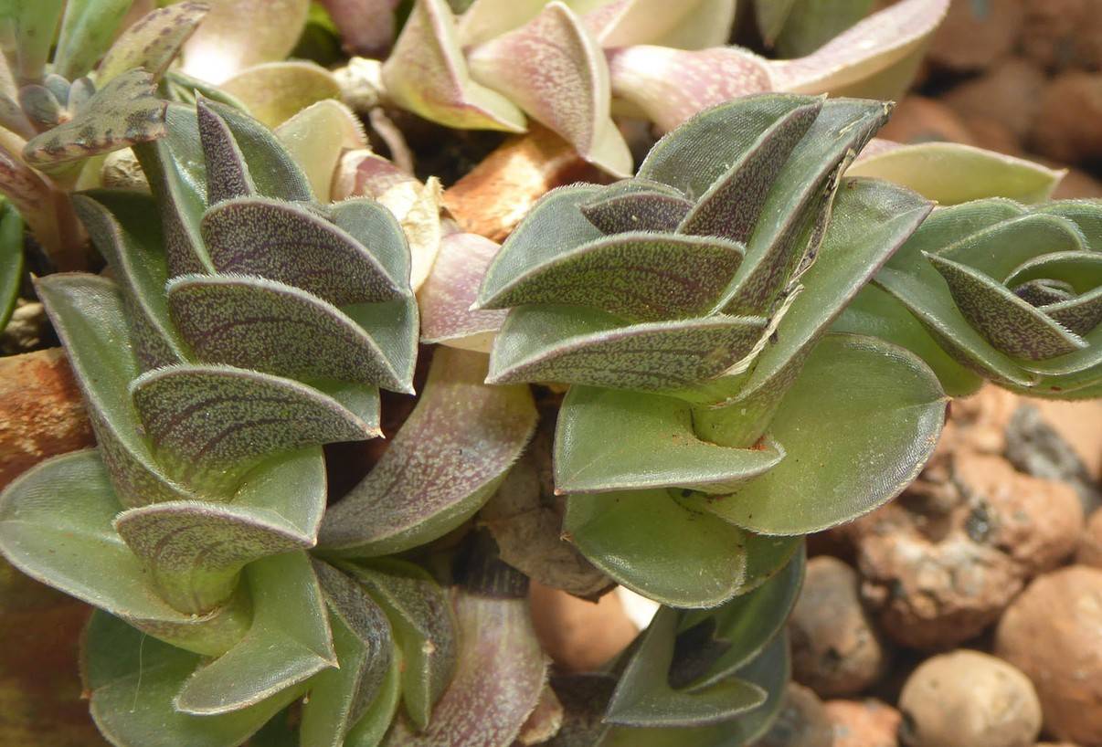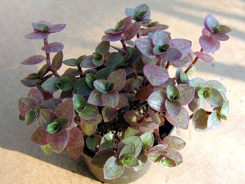 If the first plant has oblong leaves up to 20-30 cm long, then the second is distinguished by small heart-shaped elements in two rows on the stem. The front surface is green, the back is lilac-violet. On the visible part, the leaf is dotted with small purple dots.