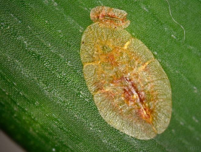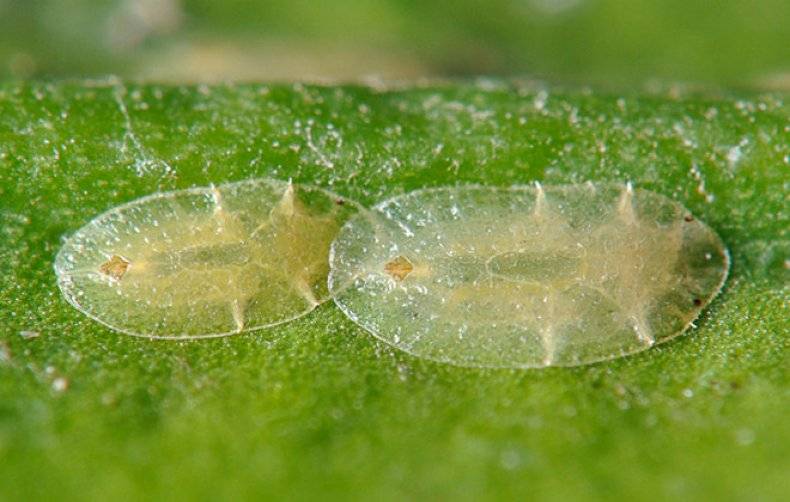 The scale insect belongs to the Hemiptera family, which numbers over 2.6 thousand species. The small size of the insect allows it to remain invisible: the body length does not exceed 2 mm. If a scale insect appears on a plant, it may die in a short time. The insect has a light body, which can be seen without a magnifying glass on the dark leaves of the flower.
