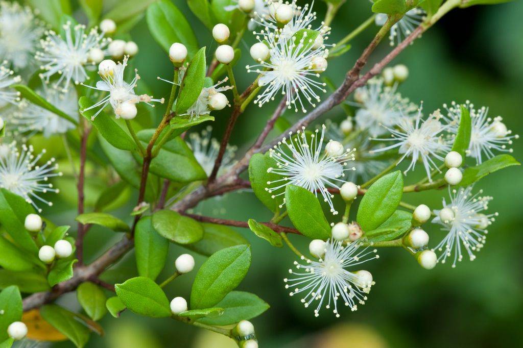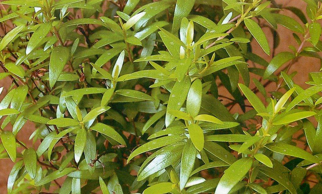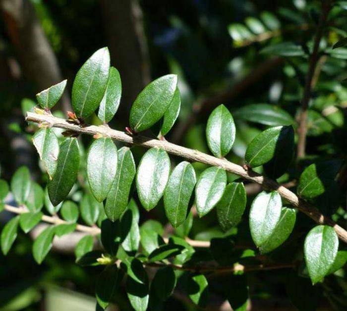 This shrub has straight and fairly branched stems with dense and leathery dark green leaves. Each leaf has a slightly pointed elongated shape, the leaves themselves grow often and quickly, holding on to small petioles, their length is from 2 to 5 cm.They can be of different shapes, it depends on the type of plant, for example, the Hekven species has leaves with characteristic wrinkled edges. Also, the leaves have a characteristic luster and a pleasant aroma coming from glands with essential and aromatic substances.