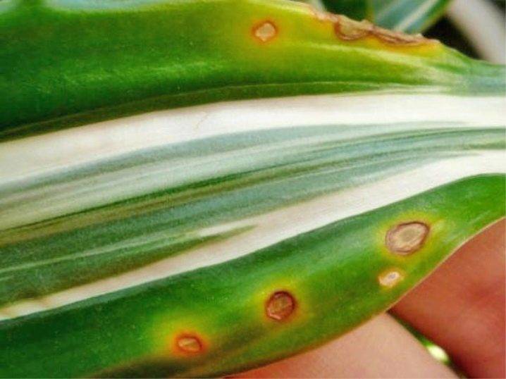 - bacteriosis. This is when the leaves turn brown at the tips, small small sores appear on the trunk, the crown quickly begins to turn yellow. A yellow oily stripe is visible between healthy and diseased leaf tissue. There is no cure, since the disease develops for a long time on a weakened plant, whose roots are damaged due to long waterlogging against a background of too hot air temperature. You can try to root a cut shoot if there are no traces of the disease on its leaves, and there is no characteristic brown ring on the cut of wood, indicating a bacteriosis lesion;