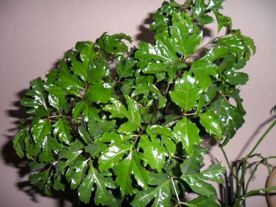 It is a branched bush 1.5 m high with large, dark green or gray leaves. They are located on long petioles. Each leaf has rounded edges and a three-blade division. The leaves are similar to those of a tree like oak. The plant quickly adapts to its new location. Gradually, additional shoots develop in the pot.