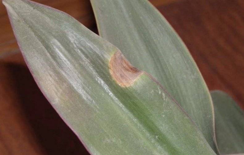 When the soil is waterlogged, rheo can be affected by fungal diseases. The main ailments are powdery mildew and gray rot. You can save a flower by transplanting it into a new land. Rotten roots are preliminarily removed, and the remaining ones are sprinkled with charcoal as disinfection.
