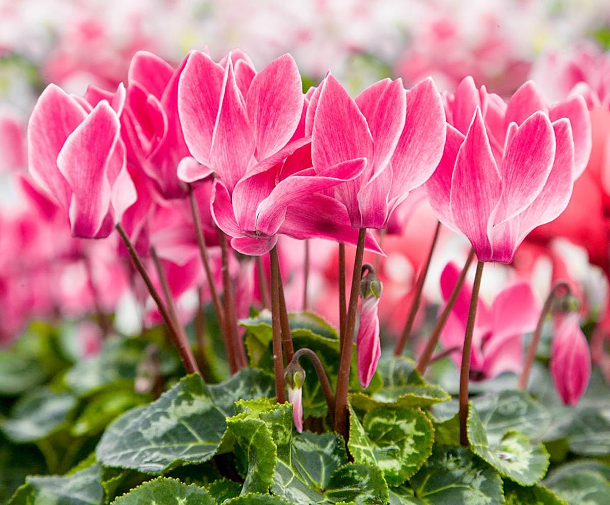- flowers are solitary, they are located at the end of a long pedicel. At the same time, the plant produces several of them, on average from 5 to 15. The released shoot with a bud twists into a spiral, but as it grows, it unwinds, and a drooping flower forms at the end. The color of cyclamens can be very diverse, both monochromatic and with a combination of several shades;