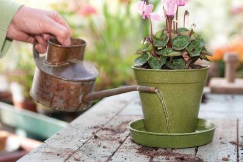 During the entire flowering period, cyclamen needs abundant soil moisture. But after its completion, the situation changes dramatically. Watering is significantly reduced, and as the foliage dries up and the tuber is exposed, it should be scarce and scarce.