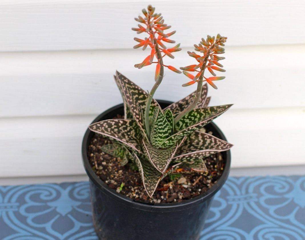 - Aloe is variegated. It is a bushy plant. The height of an adult bush is up to 30 centimeters. Shortened stem, long triangular leaves. Has a two-colored spotted color. In spring, aloe blooms with bright inflorescences that have an orange or scarlet tone.
