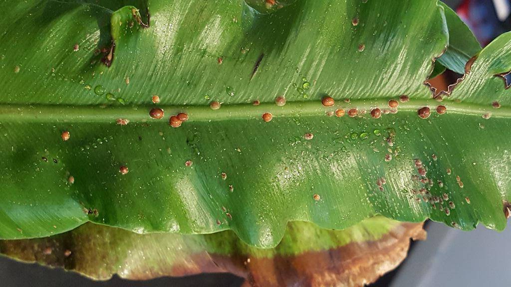 Scabbards have a dense chitinous shell. It can be light, cream, or dark brown. The size of the pests reaches 4 mm.They settle on leaves and stems; inexperienced growers may mistake them for growths on plants.