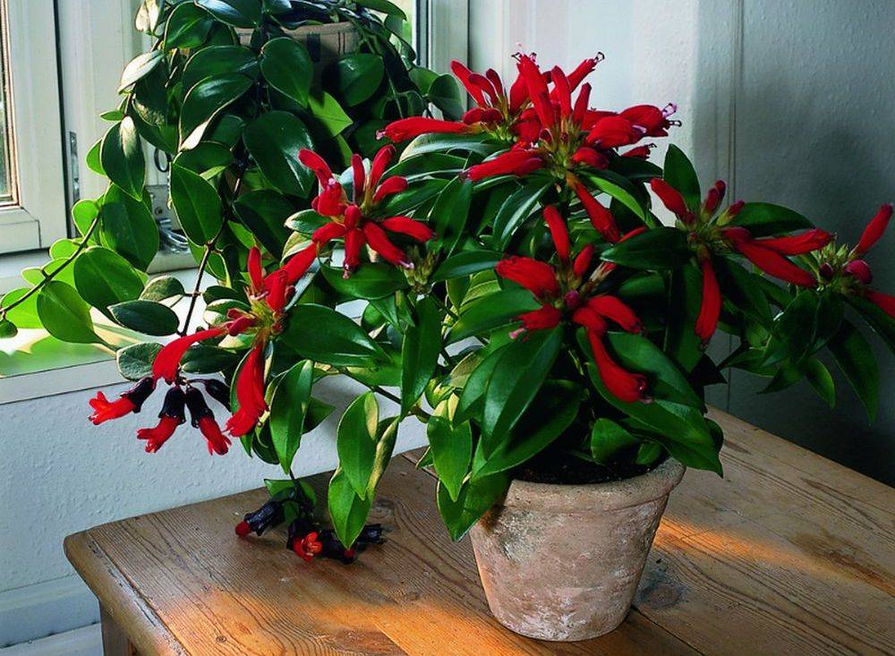The main feature of this curly indoor flower is the original, as if inverted inflorescences of a rich red color. The plant loves light, but cannot stand direct sunlight. It responds negatively to sudden temperature changes and drafts. The optimum temperature in summer is about 23-25 ° C, in winter the eschinantus is comfortable at 15-17 ° C.