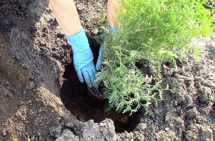 - apply mineral fertilizers during planting, the amount of which should be enough for the first two years of thuja's life in a new place;