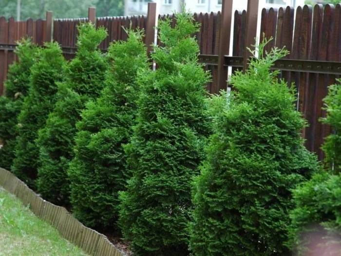 At what distance to plant thuja from each other depends on how many rows are planned in the hedge, as well as on the presence of a conventional fence. If such conifers are planned to be planted along the fence, then the minimum distance between them should be 70 cm. When planting hedges in one row, it is recommended to leave about a meter of free space between the plants.