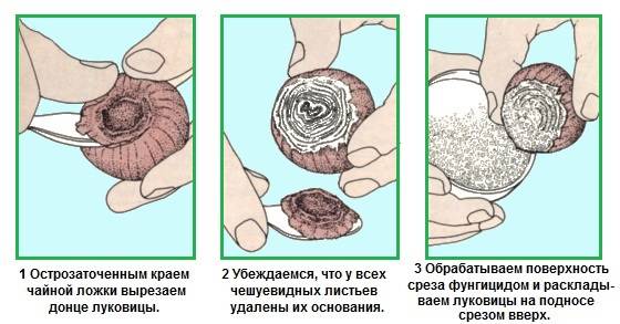 Next, the bulb is placed in a warm place (+21 degrees), this is necessary for the incisions to open. Then they are treated with a fungicide. From a large tuber, you can get from 10 to 15 children.