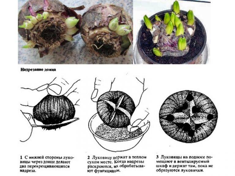 Hyacinths also reproduce by notching the bottom. For this, the lower part of the bulb is processed. The incisions are made up to 0.6 cm deep.