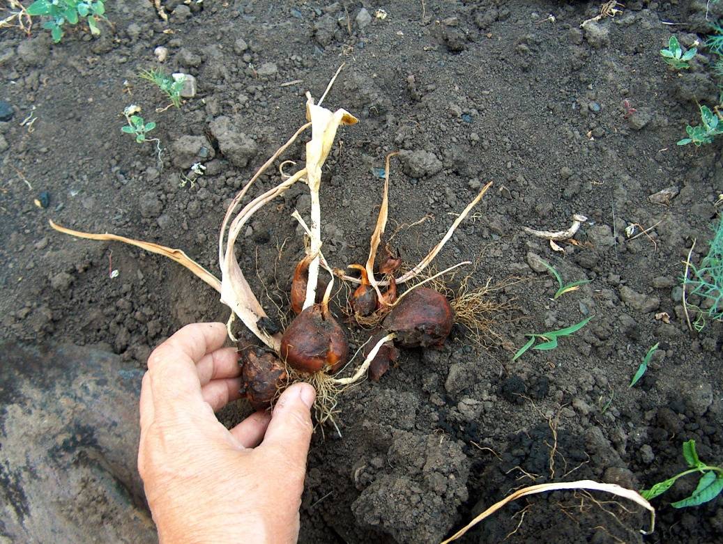- Pull out the tubers very carefully, do not remove soil and scales from the surface of the bulbs. If this is done immediately, then microbes from the soil can penetrate under the skin and begin to develop there, which will lead to their deterioration.