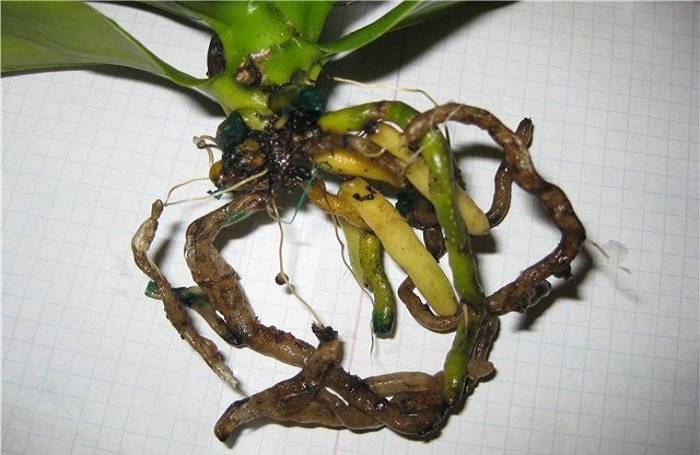 The roots of a healthy flower are light green. The affected root system is dark, often brown. In addition to discoloration, it can become wet and soft. It is these conditions that contribute to the emergence of microorganisms that cause various diseases in plants.