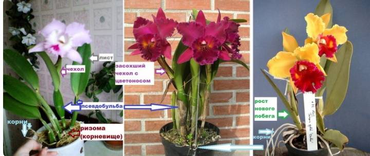 Indoor species Cattleya are numerous hybrids obtained by mixing different Orchidaceae species. They look like bushes with several superficial shoots and a horizontal rhizome - a rhizome (false bulb). From the rhizome, filaments of roots grow downward. From the buds of the rhizome, shoots grow upward - thickened stems (pseudobulbs or simply bulbs), in which nutrients and moisture accumulate. The shape of the bulb resembles a flattened spindle.