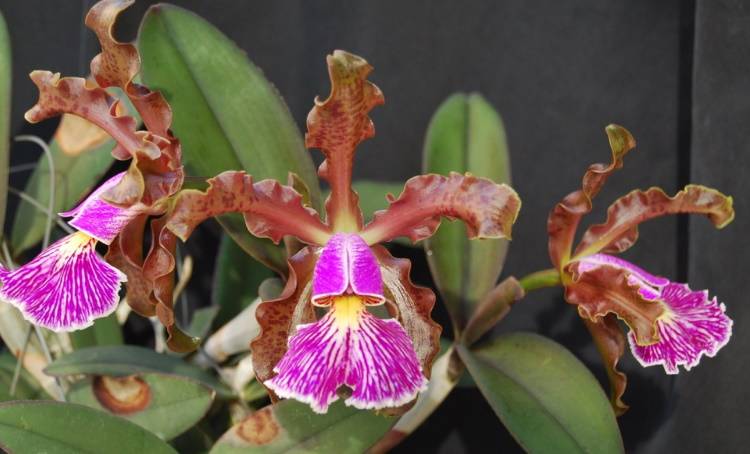 - species Cattleya Schilleriana - 1-2 buds are formed on the peduncle of the plant, the flowers of Cattleya Schilleriana are colored in brown-red-olive shades, are up to 10 cm in diameter;