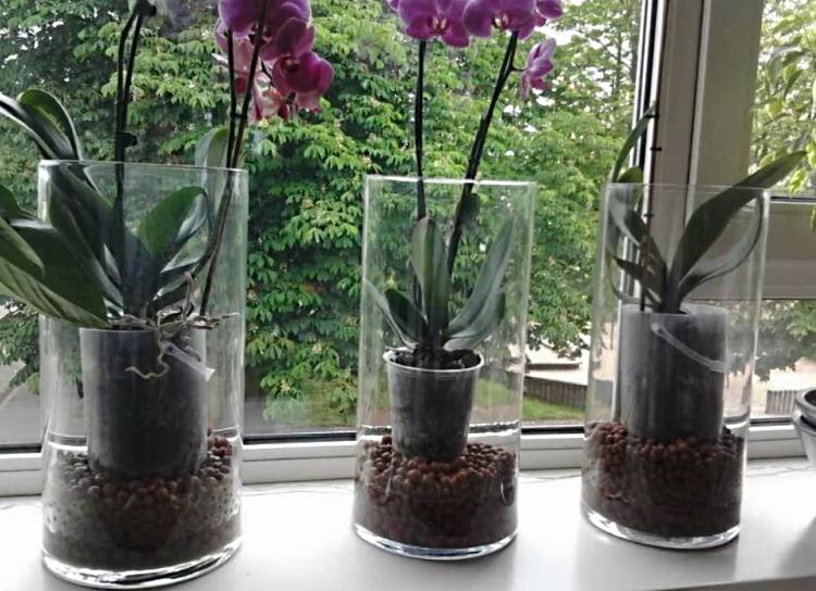 In the summer period of heat, air humidification is added to irrigation - either spraying the air in the plant growth zone, or next to flower pots, slightly away from them, put containers filled with water. The sun glare reflected from the water should not hit the orchid leaves. Thus, they achieve an increase in the level of humidity and a decrease in the temperature of the air.