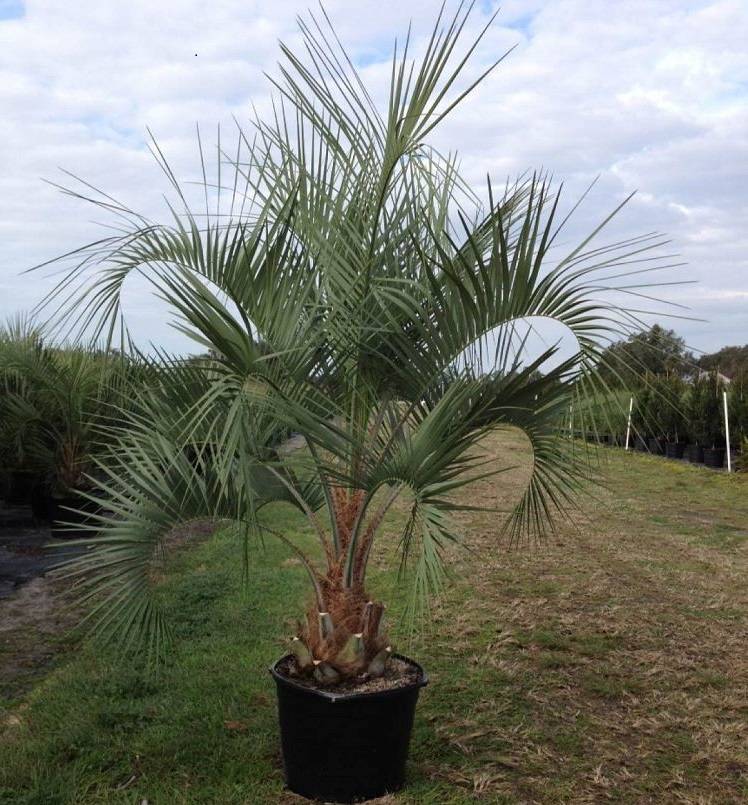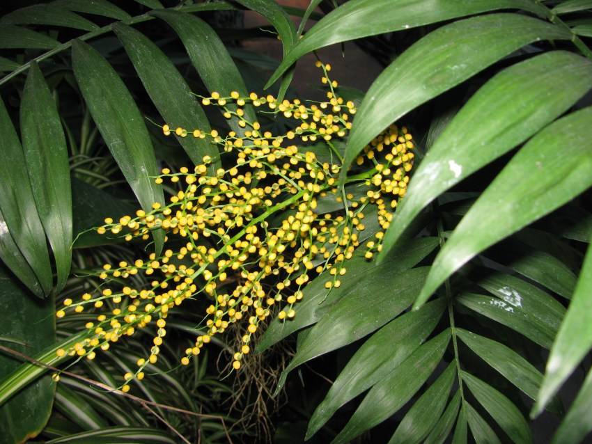 In a pot, a palm tree grows up to 1.5 meters. At 3-4 years of age, the culture begins to bloom with hundreds of bright yellow flowers. After a while, black berries appear.