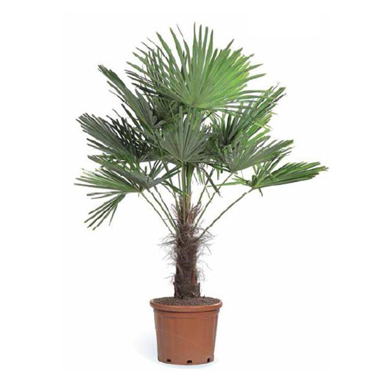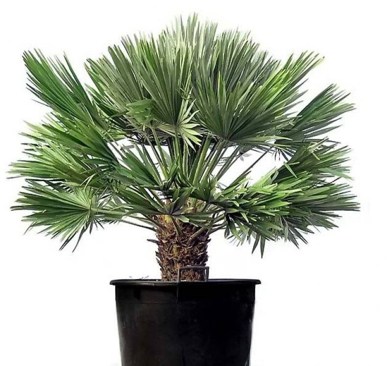 Trachycarpus fortunei is a small tree (1-2.5 meters) with large fan-shaped leaves. In summer, it blooms, the inflorescences bear fruit with black berries.