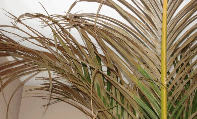 Most often, chrysalidocarpus leaves or their tips dry out due to improper care or inappropriate conditions. The palm tree often suffers from dry air and a lack or excess of moisture.