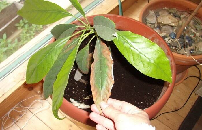 The avocado tree at home is quite sensitive to various fungal or viral diseases. If the conditions of detention are violated, then you can immediately find out about this by the state of the plant. If the leaves dry out and begin to darken for no apparent reason, then the roots of the plant were damaged during the next transplant. Burns may occur if exposed to strong sunlight.