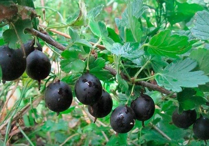 The black berries on the gooseberry are flat, inversely ovoid, about 2 cm across. The skin is dense and elastic, black with shine, without pubescence, sometimes with a bluish-gray waxy bloom. The average weight of the berry is about 3.6 g. Light green stalks about 18 mm long hold the berries tightly until ripening. The sweet and sour pulp is colored black and red with red carmine veins. Inside the berries are triangular brown-brown seeds. Ripening period - the second half of July.
