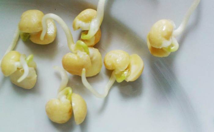 The selected seeds are soaked for half an hour in a weak solution of potassium permanganate for disinfection, then washed under running water. Before planting in a pot, the peas must be germinated on a damp cotton cloth. Germination is carried out in a warm place. You need to constantly moisten the fabric. The sprouts will hatch in 5-6 days.