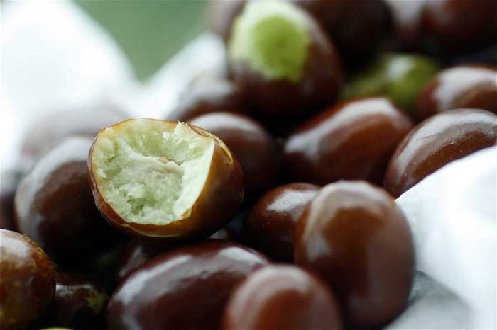 The fruits are covered with a shiny skin and are dark brown or red in color. The taste is very similar to ordinary dates. Fruit size can vary from small to large depending on the species.
