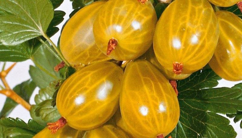 The fruits of the Russian gooseberry are rather large. The mass of one berry reaches about 4.5-6 g. They have an oval shape. The skin is of medium density, covered with a light waxy bloom. Ripe fruits are yellow-amber colored. The taste is sweet and sour with a slight gooseberry sourness. The pulp is juicy, seeds are in small quantities.