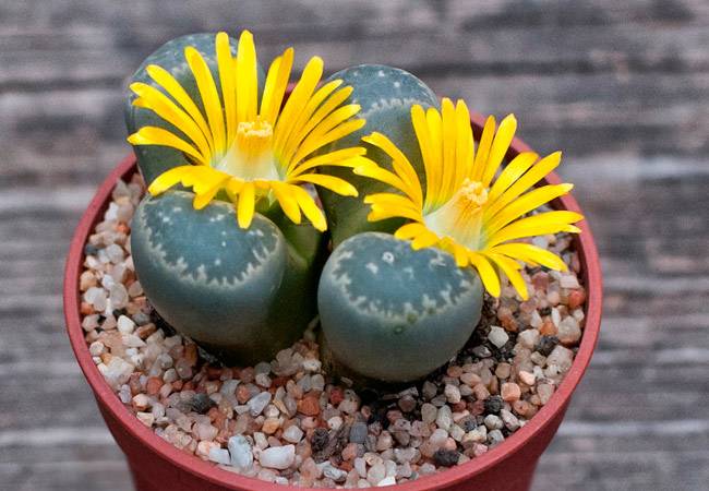 - keglevid lithops. The succulent leaf plates are quite dense. They are painted in red and brown colors. Lithops flower height does not exceed 25 mm. There are a lot of grooves on the top of the foliage. The diameter of yellow flowers does not exceed 4 cm. Gradually, the culture grows, lateral shoots begin to form;