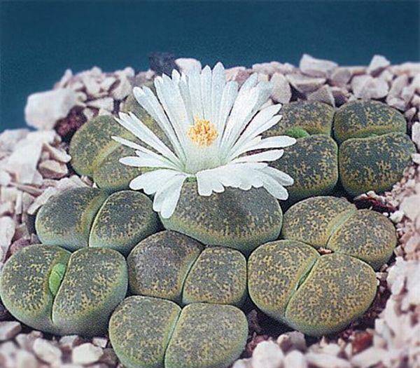 - marble lithops. There are marble patterns on the surface of the leaf plates. Living stones are painted in gray-green tones. The width of the foliage reaches 2 cm. White inflorescences are naturally endowed with large sizes;