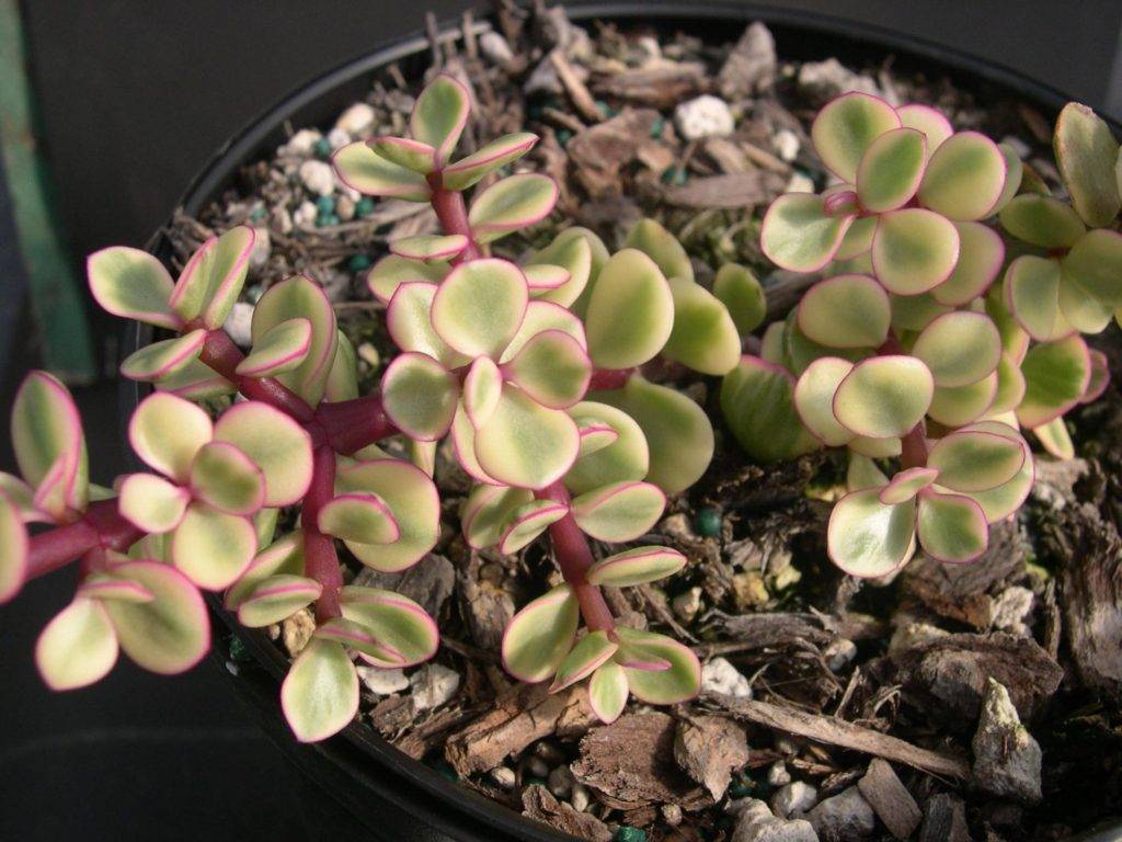 - portulacaria afra variegata tricolor. The color of its leaves is additionally pink. The middle of the leaf is white, and the edges are green, in contrast to the middle, dark, the stems and edges of the leaves are bright pink.