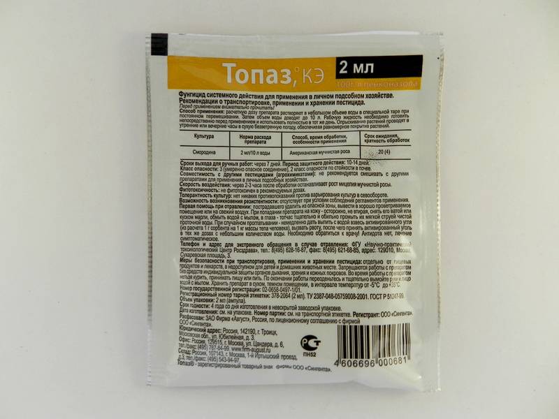 - "Topaz" - used in the fight against powdery mildew and rust. Available in 2 ml ampoules. For the treatment of bushes, take 1 ampoule per 10 liters of water.