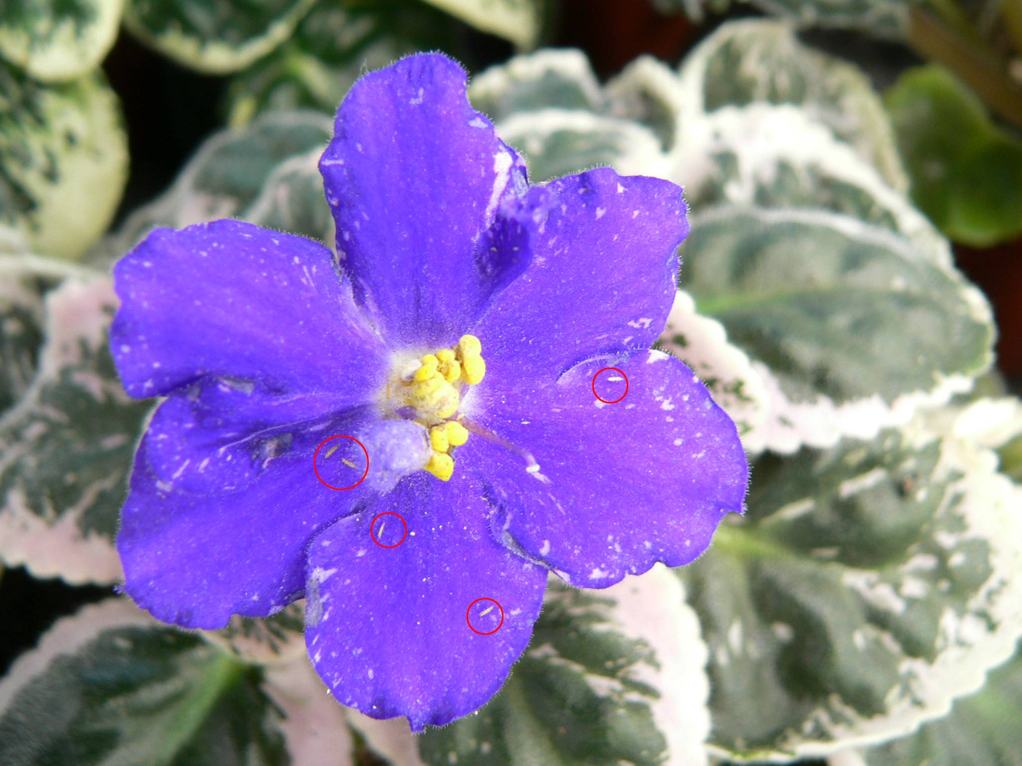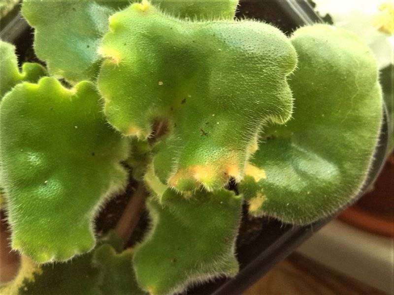 Violets are attacked by orange flat and cyclamen mites. What symptoms indicate the life of pests: thickening of the rosette, weak leaves with bloom, dropping of buds, rash of pollen, dark spots on the inside of the leaf plates.