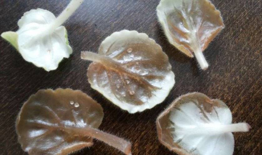 The disease starts from the root system. Then the leaves of the violets lose their density, become like cotton wool, and even with damp ground, they seem to wither. Dark spots form on them, which appear transparent from below.