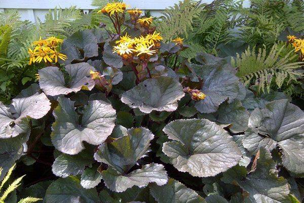 - Buzulnik Othello (otello) - grows up to 1 m, has a glossy, dark green long foliage. The seamy side of the hardwood plates is painted in a deep dark red. The flowers of Buzulnik toothed Othello have a reddish-orange color, they are included in spike-shaped large inflorescences, with a diameter of up to 13 cm.