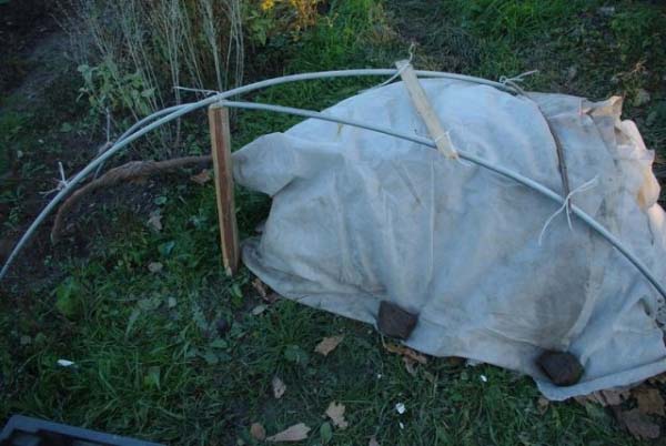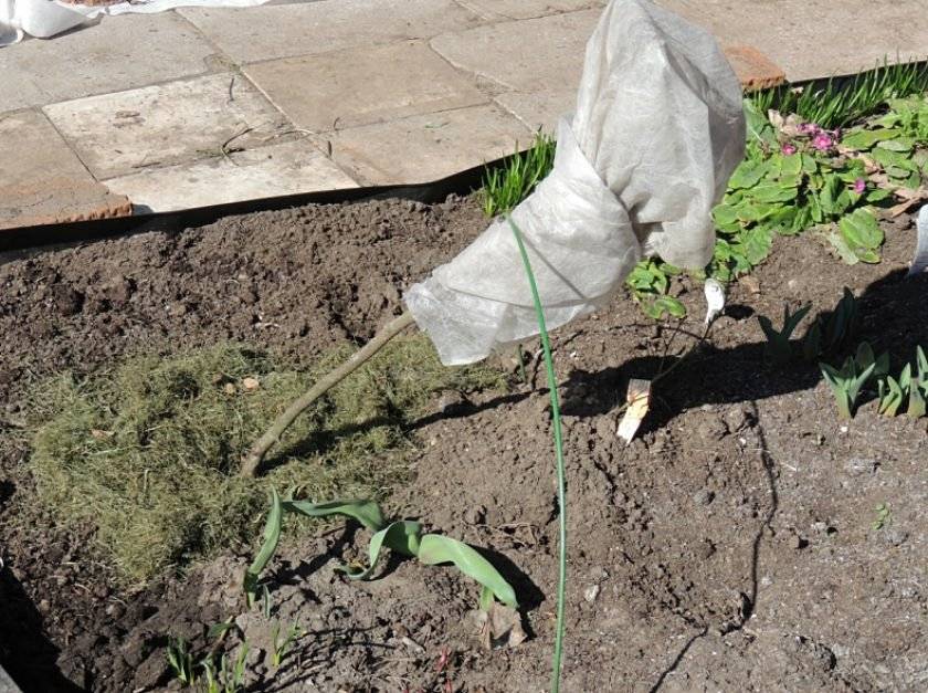 The crown is wrapped with a special insulation, and the trunk is bent to the ground. This is done very carefully so as not to break it. To do this, you can use special brackets or drive in a peg 20 cm from the base of the trunk and tie a stem to it. The crown should be as close to the soil as possible. It is covered with spruce paws, covered with leaves and another layer of spruce branches, which will not allow the leaves to scatter.