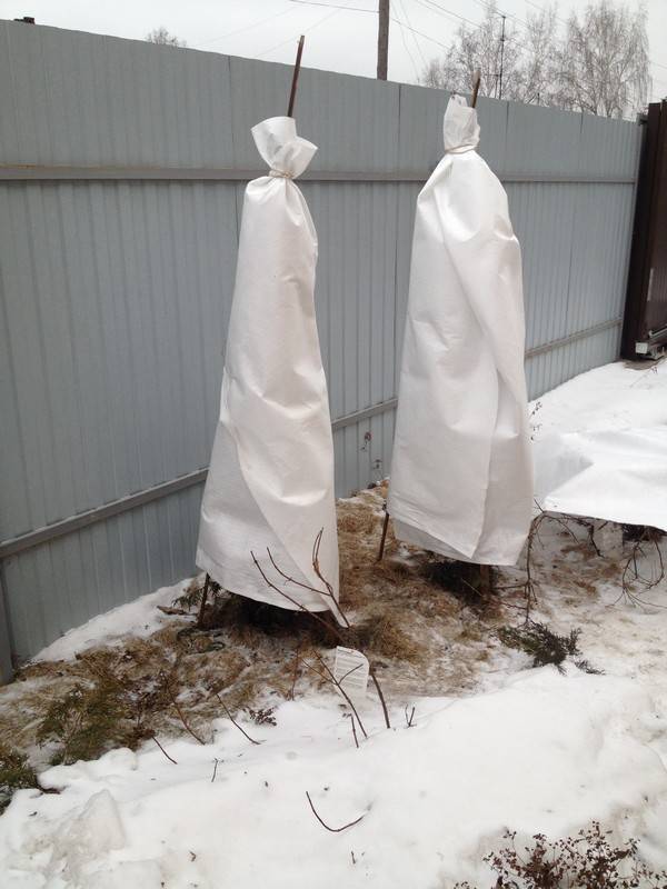 - After the onset of the first frost, the branches of low bushes are pressed to the ground, fixed with brackets specially designed for this and covered with foliage. The branches of tall bushes, previously connected to each other, are covered with dense burlap or special non-woven material, which is fixed with clothespins.