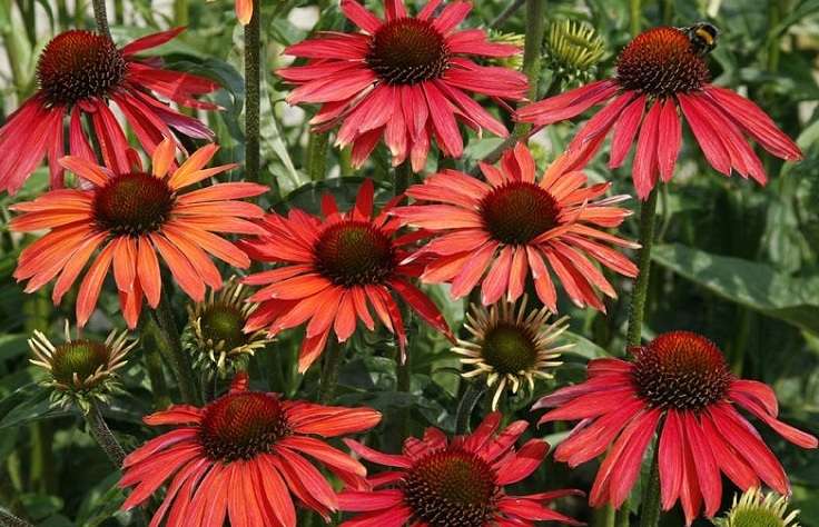 Echinacea Eccentric can be called one of the most outstanding varieties. On elastic and strong stems, the height of which reaches 60 centimeters, in the second half of July, double flowers of a bright red hue with a rich purple tint appear. At the end of summer, the flowers take on an orange tone.