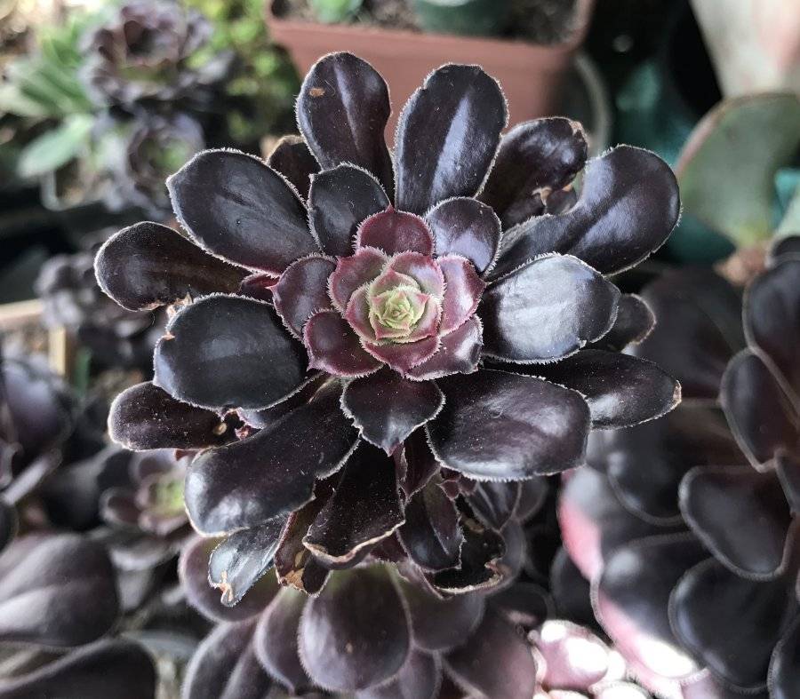 - aeonium black is a perennial plant with a short stem, the trunk is covered with foliage of dark green color with a gray tint. The rosette diameter can be up to 80 cm;