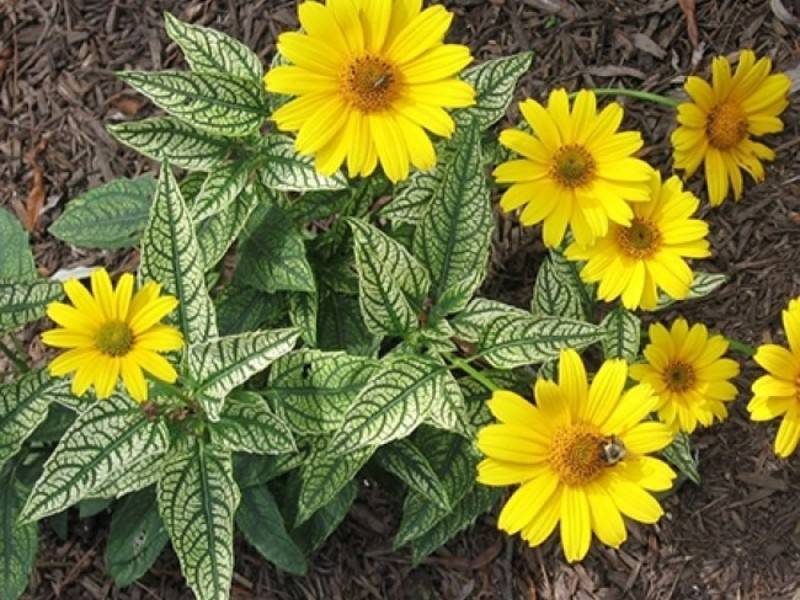 Plants of this species are distinguished by the variegated color of the leaves. Due to the presence of mutant cells that are unable to produce chlorophyll, light spots and streaks gradually appear on the leaves of heliopsis variegated.