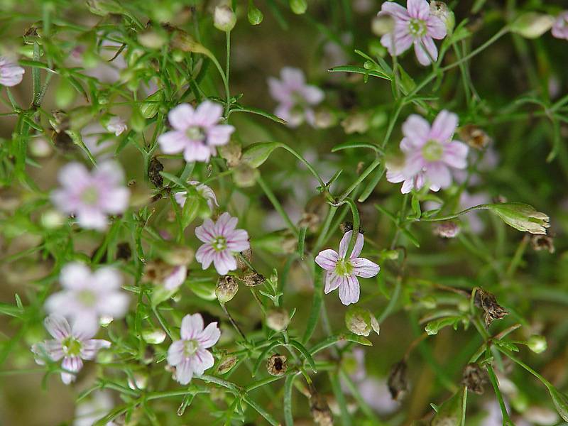 Gypsophila creeping pink forms only one, but highly branched stem, which spreads along the ground. Height 20-40 cm.Flowers 3-6 mm in diameter. The petals are pink or white. In floriculture, since 1774, white gypsophila has been used as an extremely unpretentious border plant that does not need any care, including a very drought-resistant one.