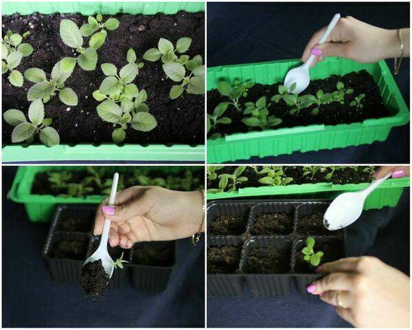 - The first time the seedlings are transplanted a month after the emergence of shoots. At this stage, the seedlings are planted in several pieces in new pots. They are carefully dug up with a spoon and planted together with the soil. Then the soil is sprayed with water.