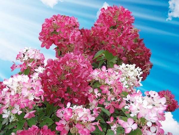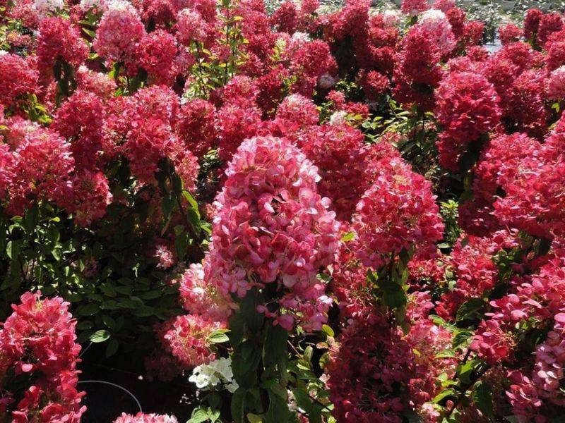 The buds are large in size, gather in the form of panicles. The length of the inflorescences can reach 30-40 cm. The variety begins to bloom in the second or third decade of June, it all depends on temperature indicators. Hydrangea Diamant Rouge first blooms with white panicles, then the buds turn pink, and only by autumn they acquire a red hue.