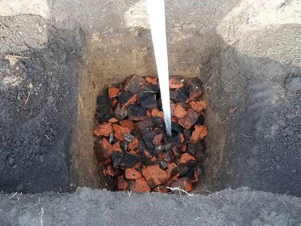 Further, a layer of soil mixture is poured onto the drainage, a seedling is installed, the earth is poured and compacted. Watering and mulching completes the planting.