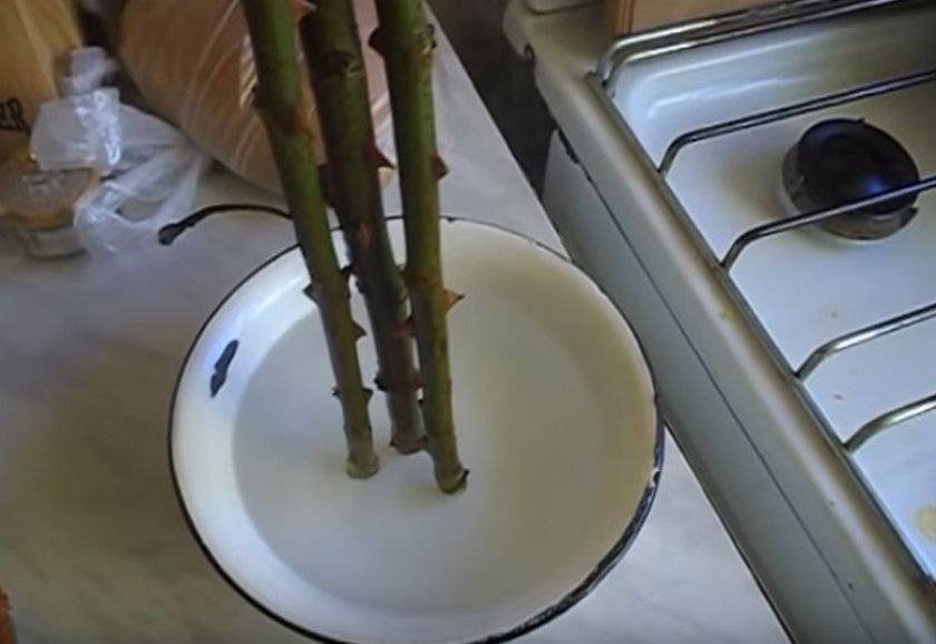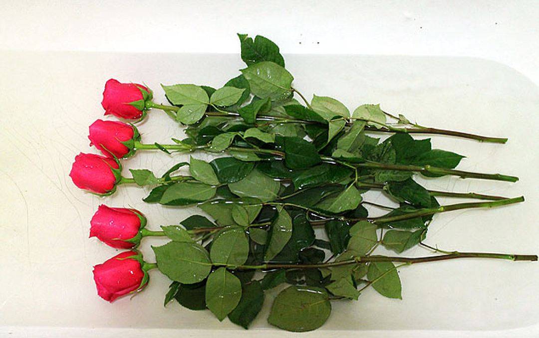For these purposes, roses are either left overnight in a bathtub filled with cold water, or placed in a vase high enough so that the entire stem is immersed in liquid.