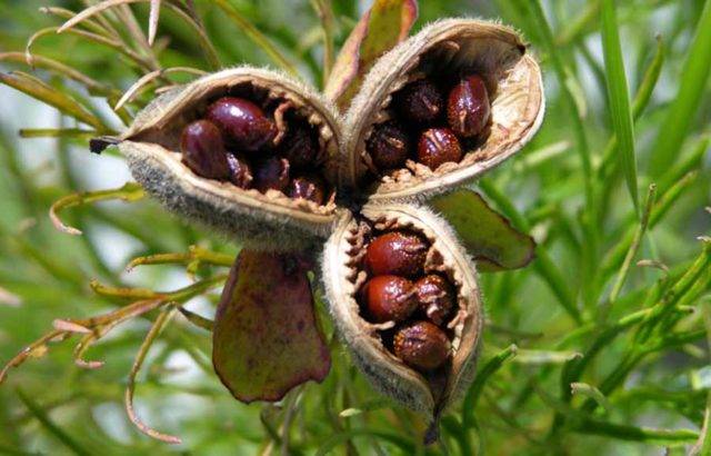 The seed capsule of the peony is star-shaped and painted in a pale green color. To get seeds, you need to leave a flower on the plant. Seed material will be formed around August. The seeds are collected and stored in the refrigerator.