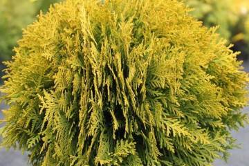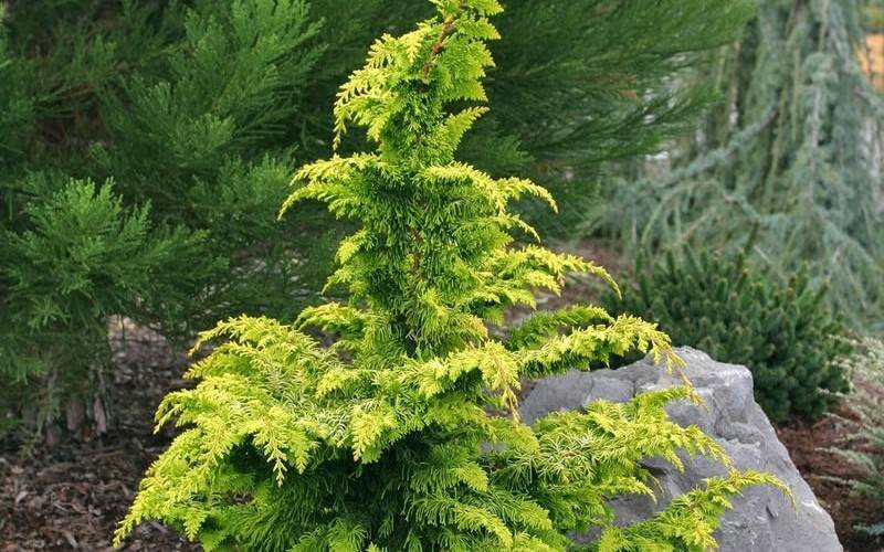 A pyramidal loose shrub with an unusual color. Young leaves have a lemon hue, over time they turn green. The height of an adult cypress is 2 m.It is used to decorate group plantings, as well as in single compositions. Suitable for the climate of the Perm region.