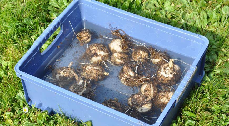 - carefully, slightly digging, pull the bulbs out of the soil by the stem of the plant. Gently remove soil;